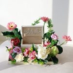 contain: plain wood tray, writing acrylic, 1 ring stands, and fresh flowers