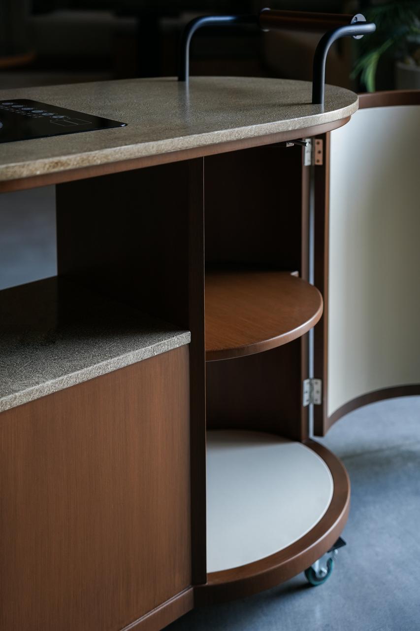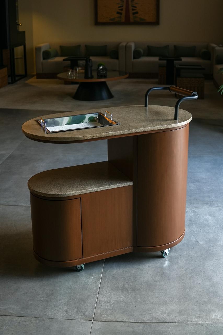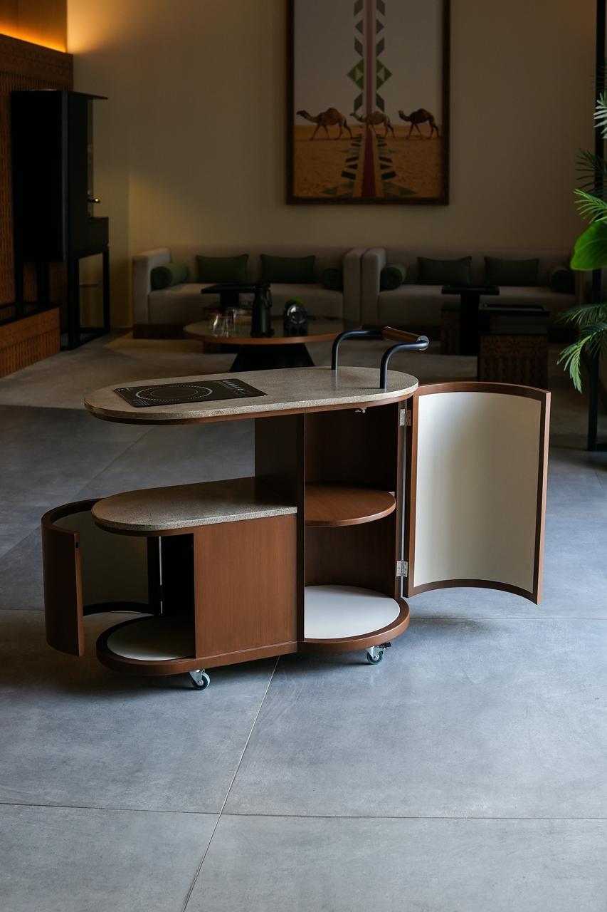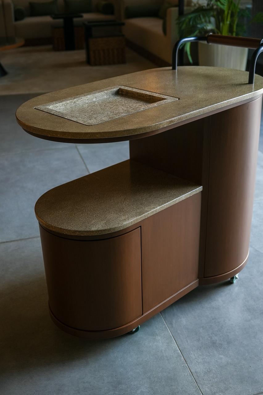 Material Used:- Teak Wood, Beach Wood, Metal Rod,Heavy Duty Wheels, Electronic Hot Plate and Steel tray with White cement